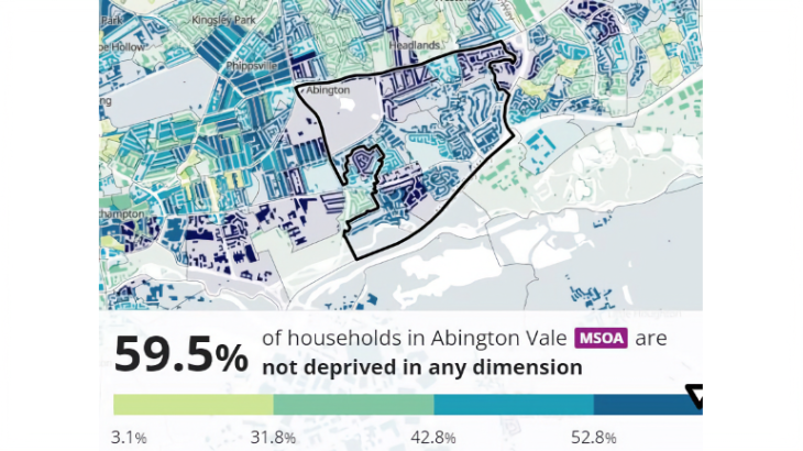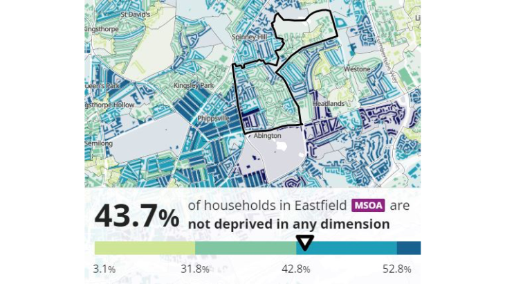 - Kingsthorpe St David – 40% of households are not deprived in any dimension but walk across the Cock Hotel Junction to Kingsthorpe Village and it is 50%. Concurrently, 28.7% of households in St David are car-less, it is 19.3% in the village.