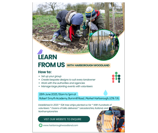 Our guest speaker this month was Bruce Durham, founder of Harborough Woodland (HW)1. This community group have made a tremendous impact since their beginnings 5 years ago – you can read more about their story here2. They are also running a free training event on Saturday 28 June – details on their Facebook page3, or email info@harboroughwoodland.com