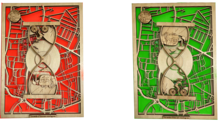 Zoe Anderson chose to illustrate the theme of Time is Running Out with a brilliant egg timer that rotates over a cut out map of Northampton town centre to illustrate the pollution differences between active travel versus private car use.